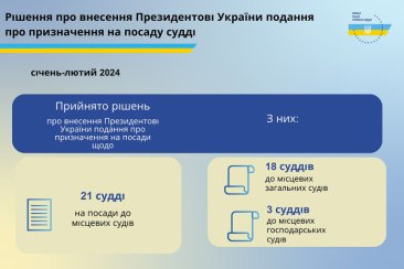 Протягом січня - лютого 2024 року Вища рада правосуддя ухвалила рішення про внесення подання Президентові України про призначення 21 судді на посади до місцевих судів, з них: