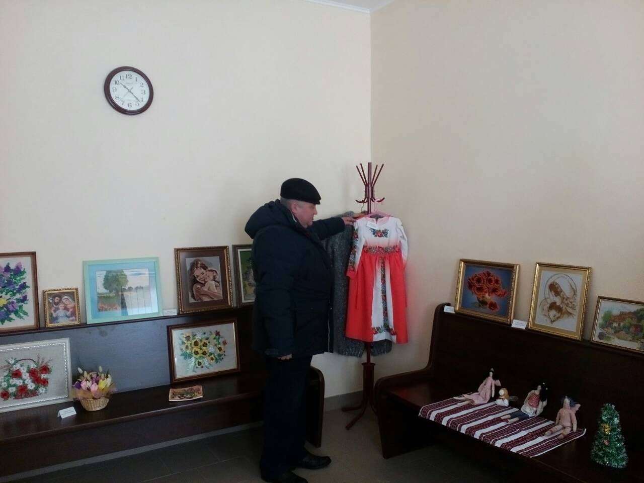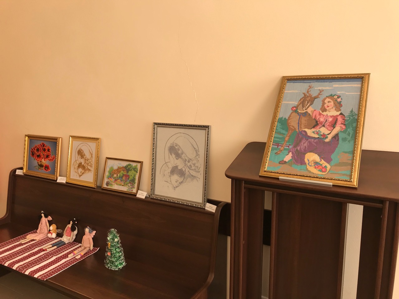 В експозиції представлені вишиті картини, вишиті ікони, в’язані вироби, вироби з бісеру, вишиванки, рушники та серветки. Поряд з картинами також представлені авторські ляльки.
