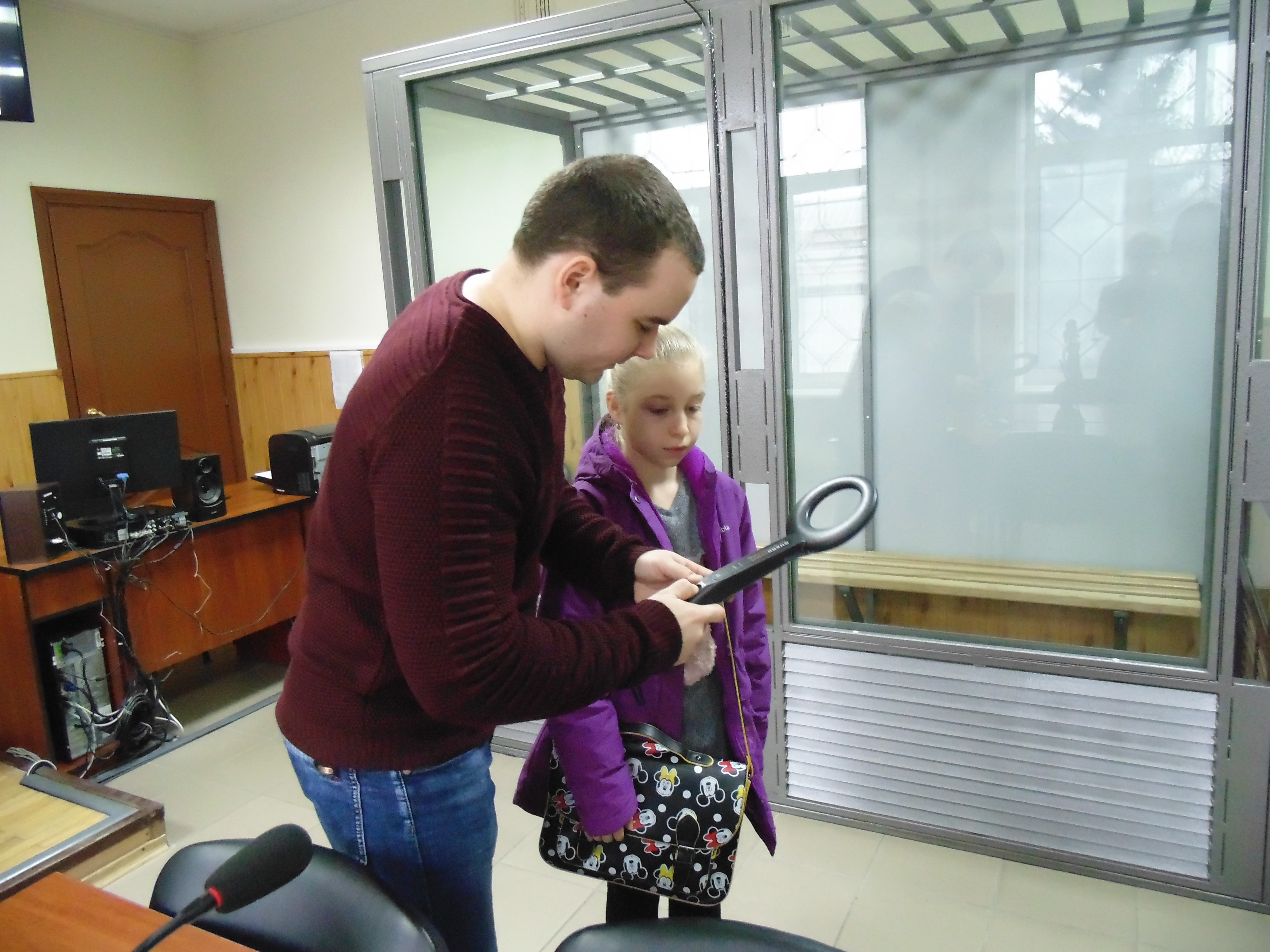 Судовий розпорядник Богдан Шкрумада розповів хлопцям та дівчатам про символи судової влади та наглядно продемонстрував суддівську мантію і нагрудний знак, в яких суддя обов’язково перебуває при здійсненні правосуддя. Потім продемонстрував як працює справжній ручний металодетектор.