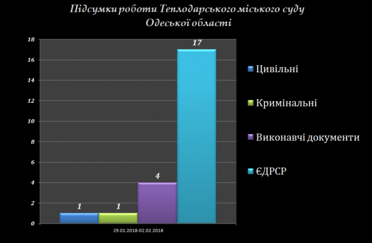 Так за період з 29 січня по 02 лютого 2018 року Теплодарським міським судом Одеської області розглянуто: